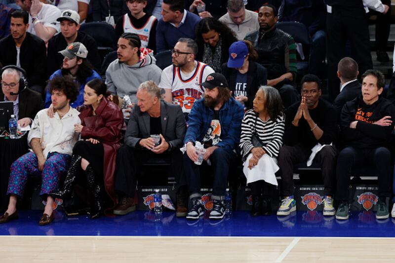 Philadelphia 76ers v New York Knicks - Game Two NEW YORK, NEW YORK - APRIL 22: Celebrities Benny Blanco, Selena Gomez, Sting, Chris Rock, and Ben Stiller attend the game between the New York Knicks and the Philadelphia 76ers in Game Two of the Eastern Conference First Round Playoffs at Madison Square Garden on April 22, 2024 in New York City. NOTE TO USER: User expressly acknowledges and agrees that, by downloading and or using this photograph, User is consenting to the terms and conditions of the Getty Images License Agreement. (Photo by Sarah Stier/Getty Images) (Sarah Stier/Getty Images)