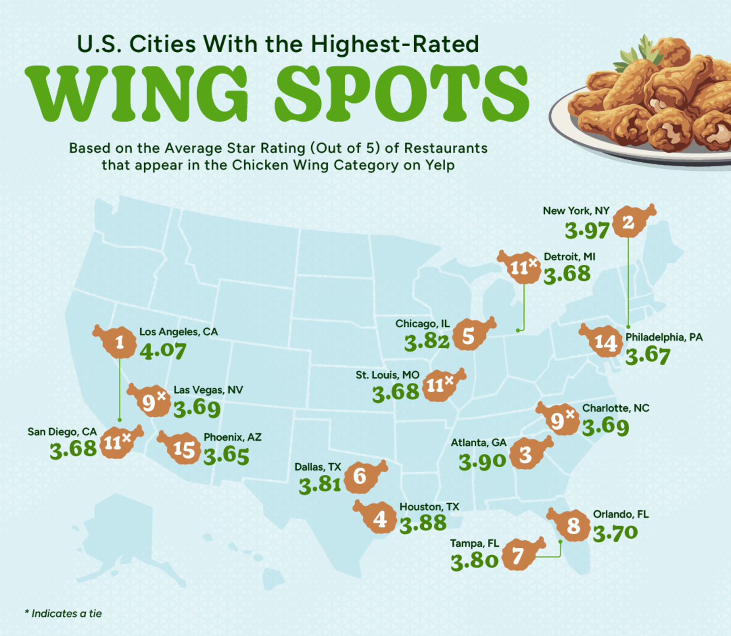 The study analyzed Yelp data in the 100 largest U.S. metros to find the best cities for chicken wings, focusing on restaurants where wings were a featured menu item.