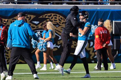 Tennessee Titans v Jacksonville Jaguars - NFL 2025 JACKSONVILLE, FLORIDA - JANUARY 04: Trevor Lawrence #16 of the Jacksonville Jaguars celebrates a touchdown from the team during the fourth quarter against the Tennessee Titans at EverBank Stadium on January 04, 2026 in Jacksonville, Florida. (Photo by Mike Carlson/Getty Images) (Mike Carlson/Getty Images)