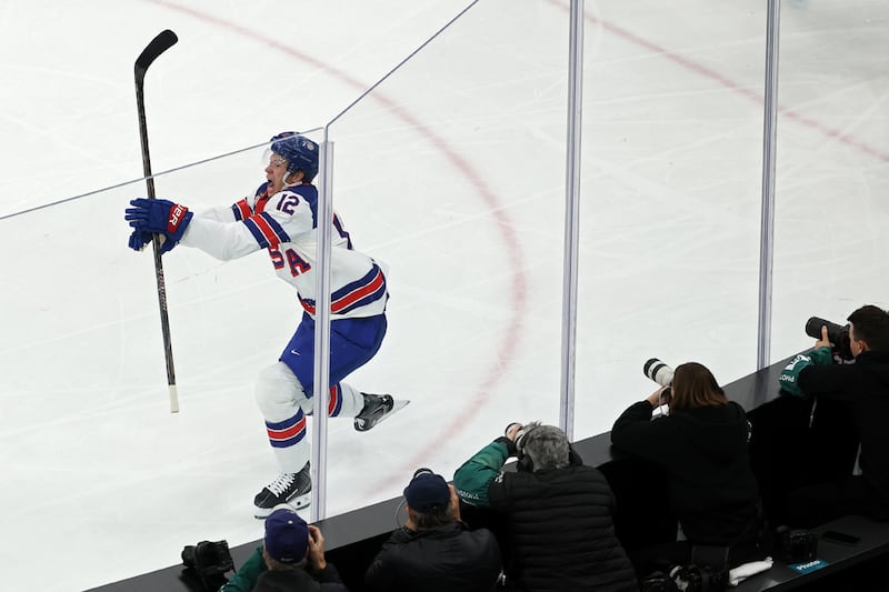 Ice Hockey - Milano Cortina 2026 Winter Olympics: Day 16 MILAN, ITALY - FEBRUARY 22: Matt Boldy #12 of Team United States celebrates after scoring a goal in the first period during the Men's Gold Medal match between Canada and the United States on day 16 of the Milano Cortina 2026 Winter Olympic games at Milano Santagiulia Ice Hockey Arena on February 22, 2026 in Milan, Italy. (Photo by Elsa/Getty Images) (Elsa/Getty Images)