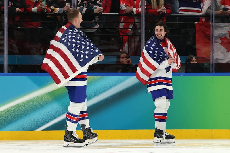 Ice Hockey - Milano Cortina 2026 Winter Olympics: Day 16 MILAN, ITALY - FEBRUARY 22: Jack Hughes #86 and Quinn Hughes #43 of Team United States celebrates following the Men's Gold Medal match between Canada and the United States on day 16 of the Milano Cortina 2026 Winter Olympic games at Milano Santagiulia Ice Hockey Arena on February 22, 2026 in Milan, Italy. (Photo by Elsa/Getty Images) (Elsa/Getty Images)