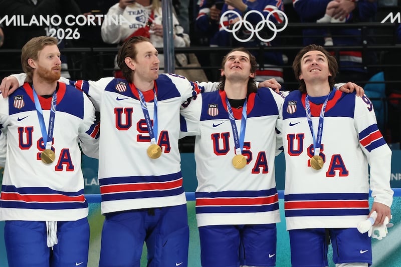 Ice Hockey - Milano Cortina 2026 Winter Olympics: Day 16 MILAN, ITALY - FEBRUARY 22: Team United States listen to the national anthem during the medal ceremony for Men's Ice Hockey following their gold-medal win during the Men's Gold Medal match between Canada and the United States on day 16 of the Milano Cortina 2026 Winter Olympic games at Milano Santagiulia Ice Hockey Arena on February 22, 2026 in Milan, Italy. (Photo by Bruce Bennett/Getty Images) (Bruce Bennett/Getty Images)