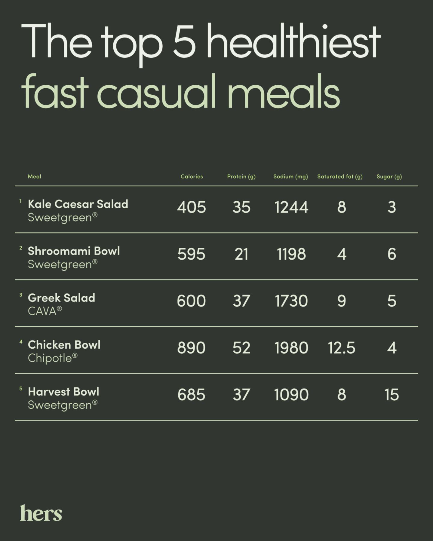 - Sweetgreen and Cava are the three healthiest options for fast-casual lunches when you're on the go. They each have low sodium, sugar, and saturated fat levels while still containing over 20 grams of protein.