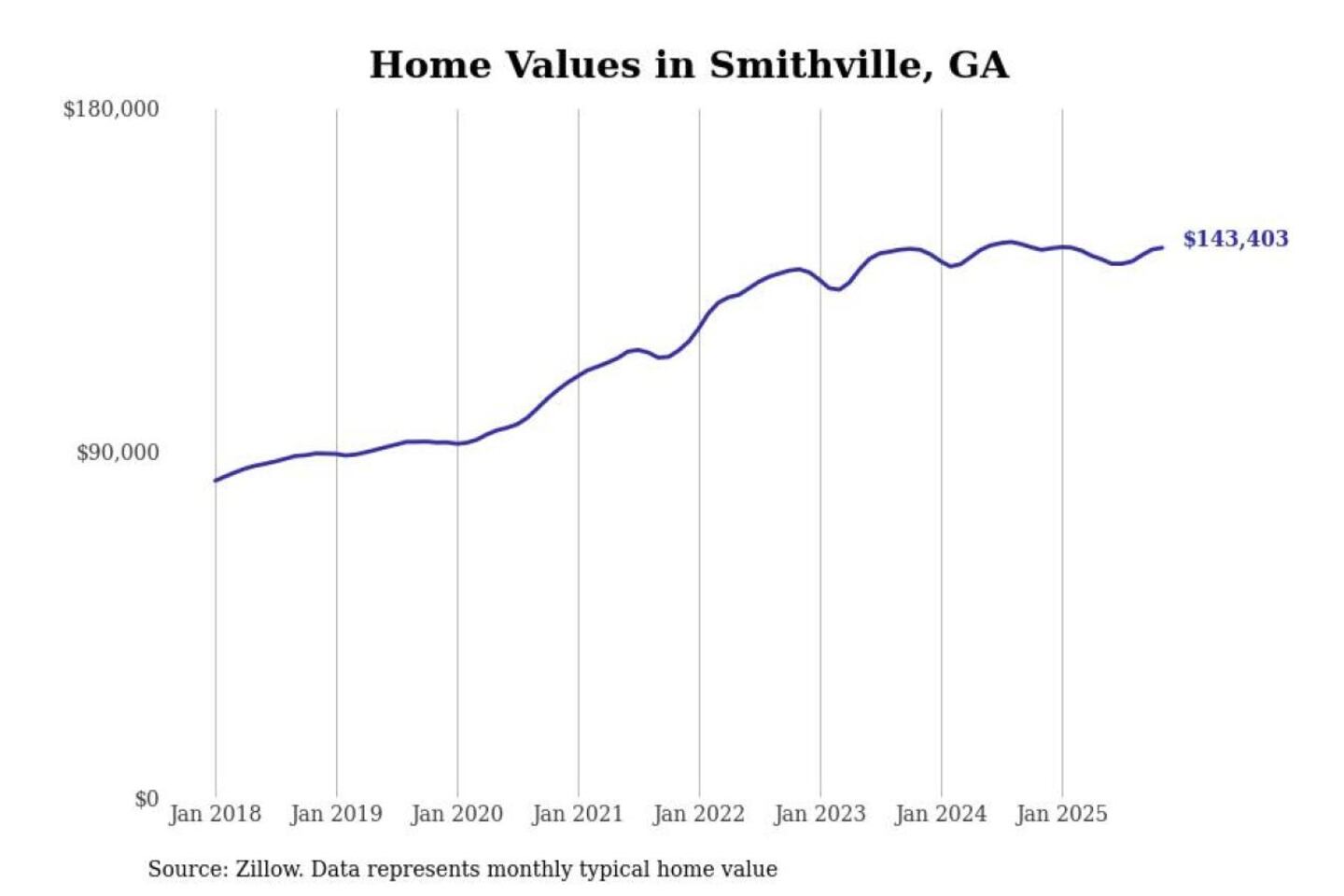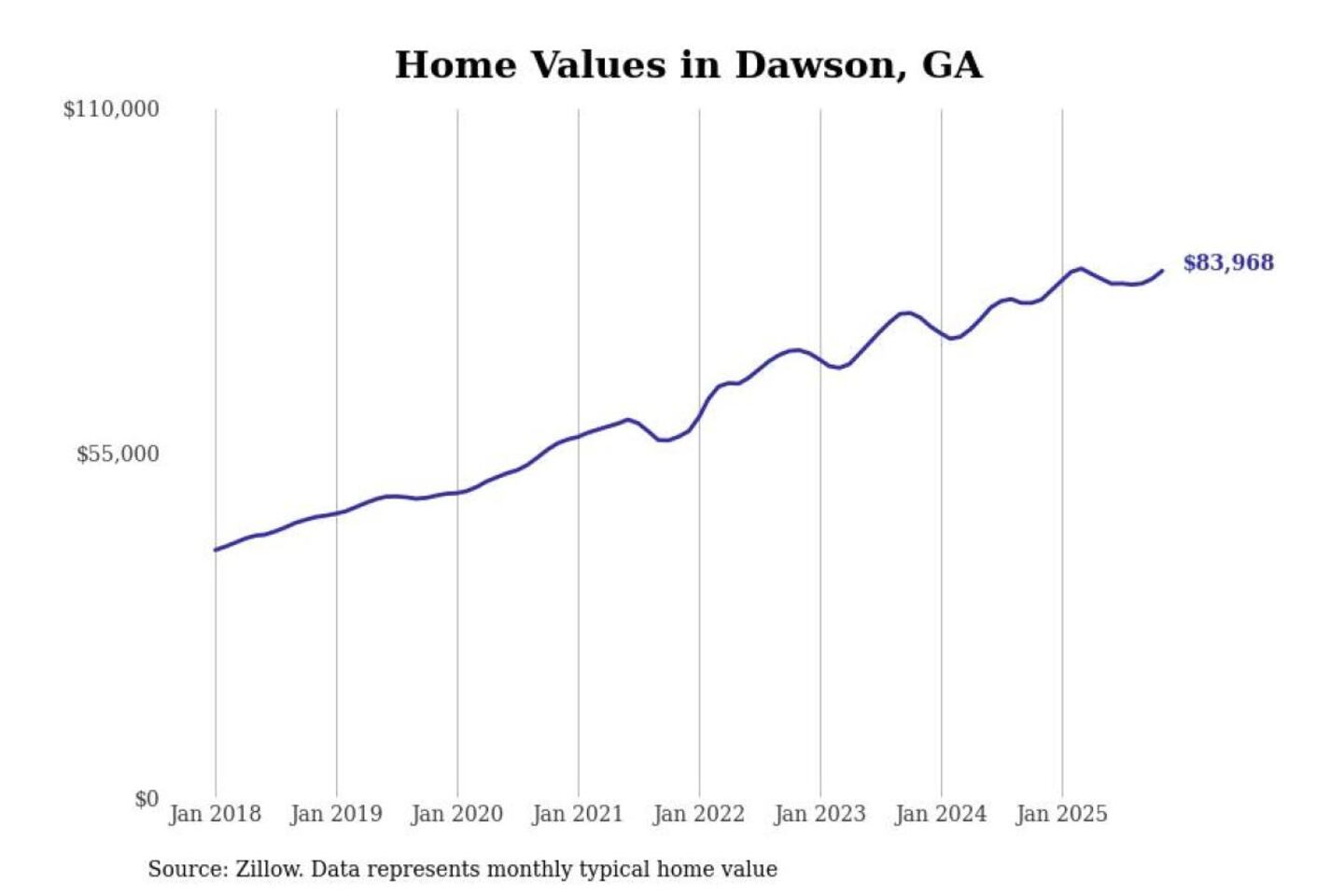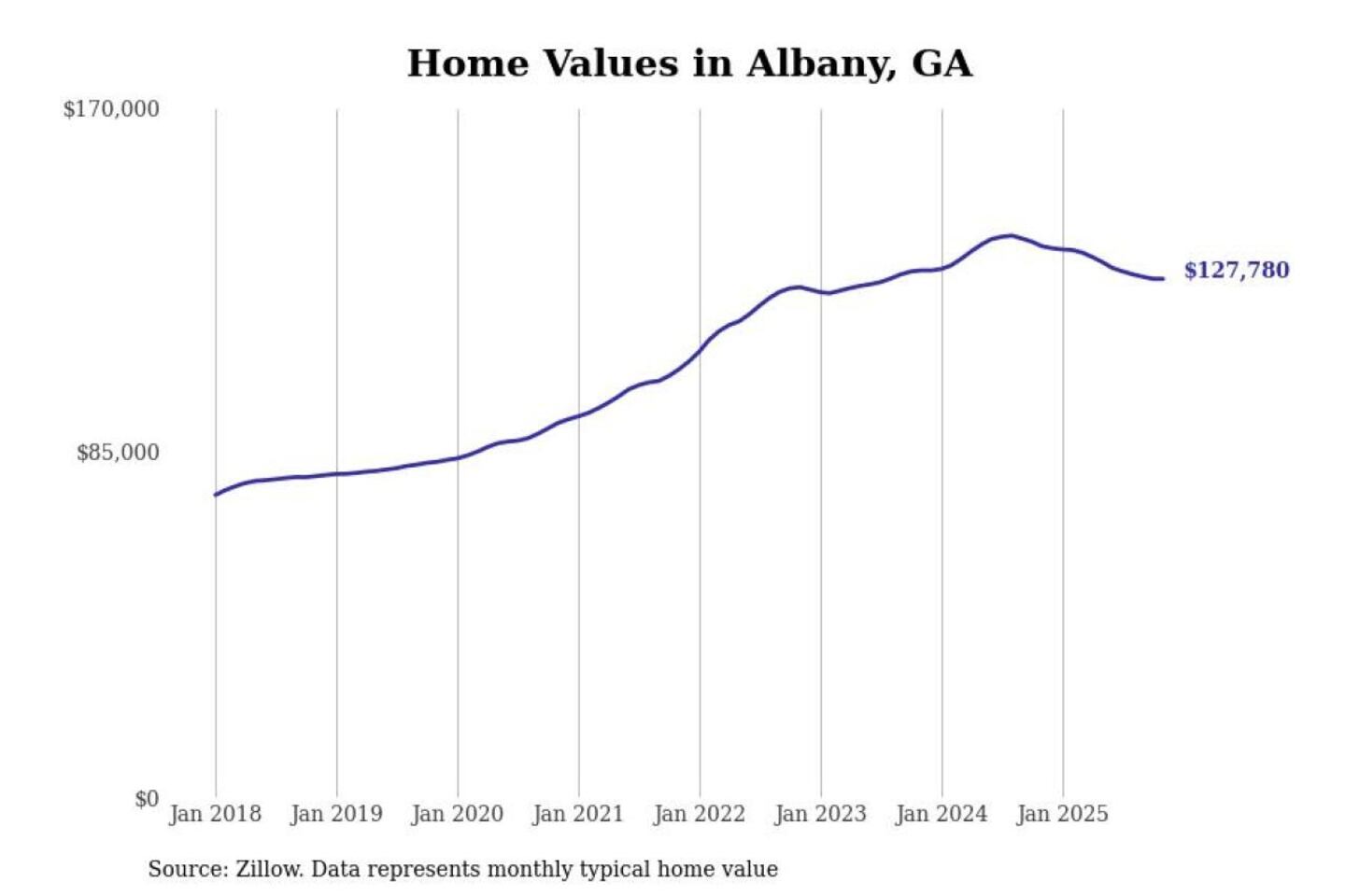 Stacker compiled a list of cities with the most expensive homes in the Albany, GA metro area using data from Zillow. Charts show the monthly typical home value since January 2018.