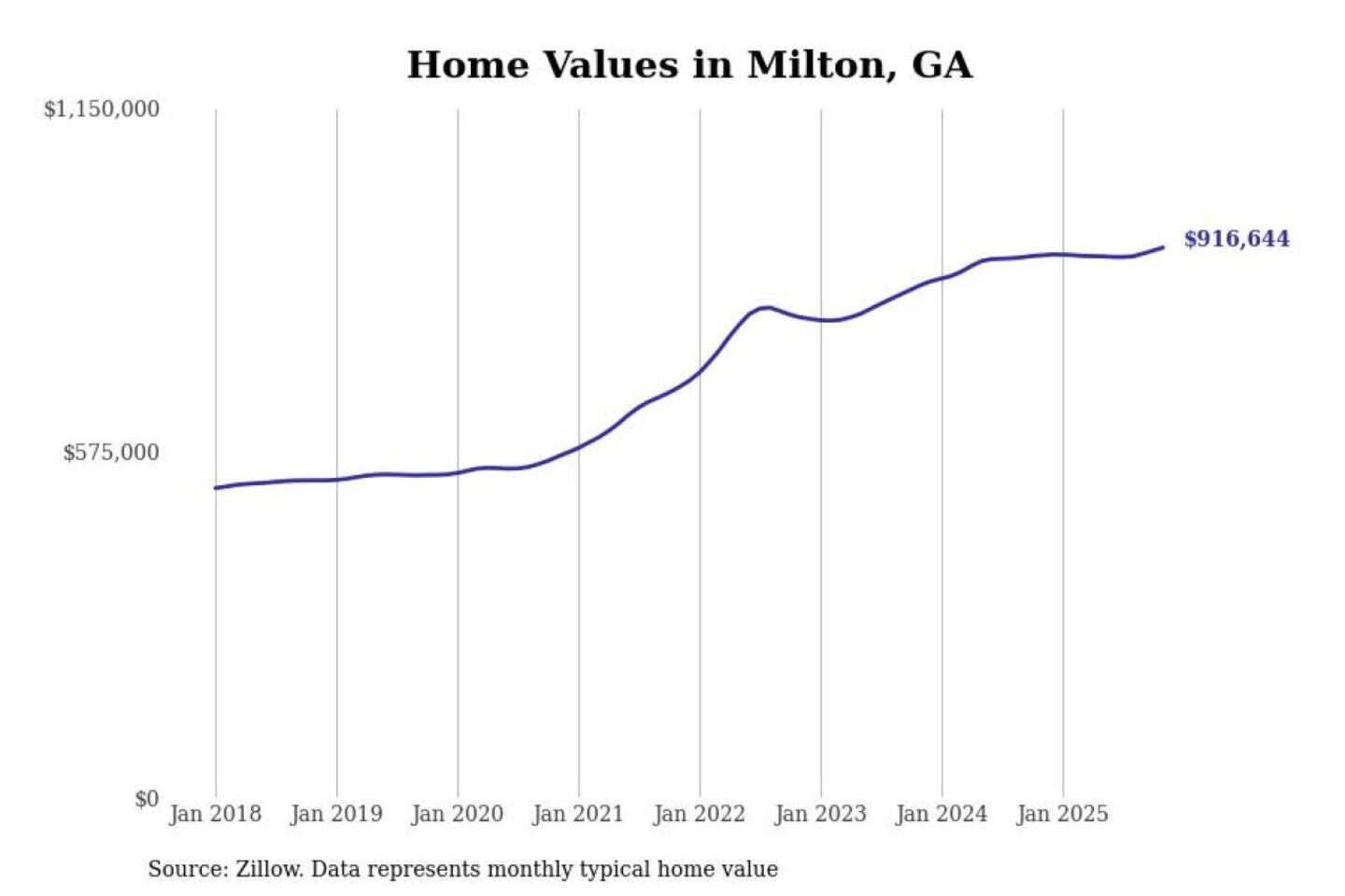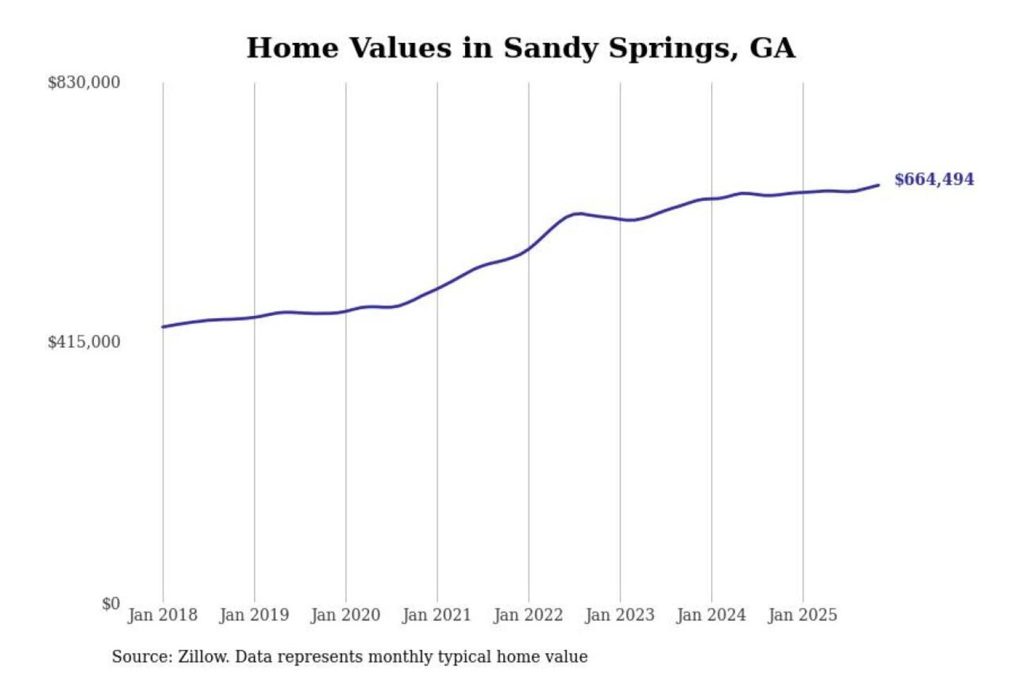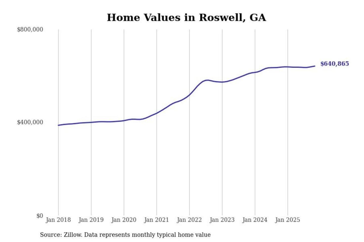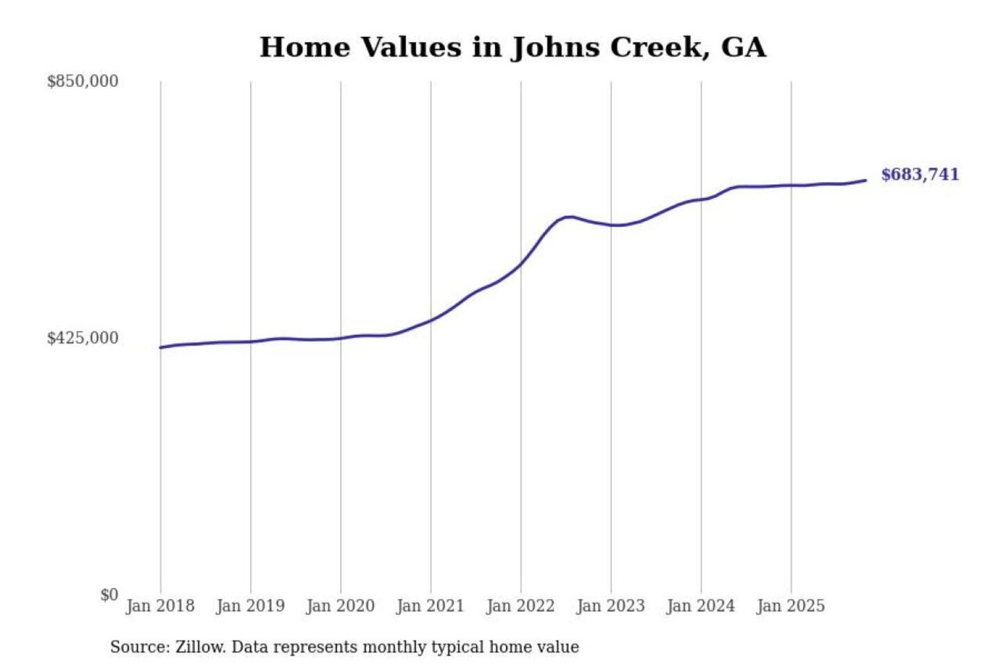 Stacker compiled a list of cities with the most expensive homes in the Atlanta-Sandy Springs-Alpharetta, GA metro area using data from Zillow. Charts show the monthly typical home value since January 2018.