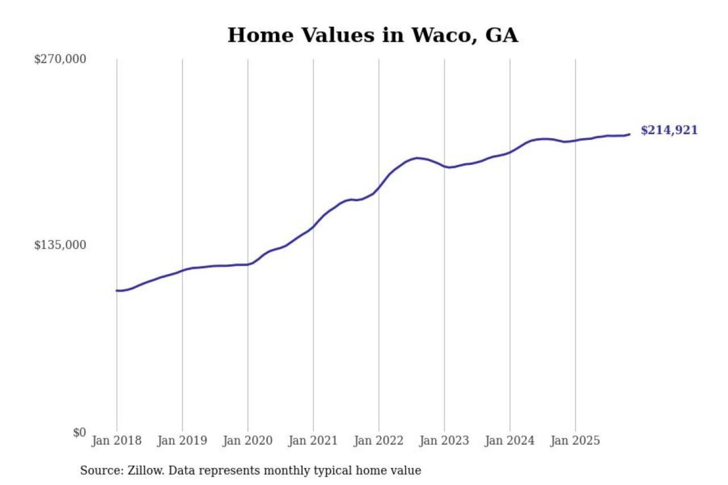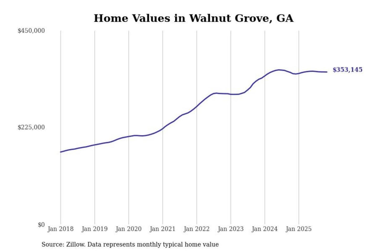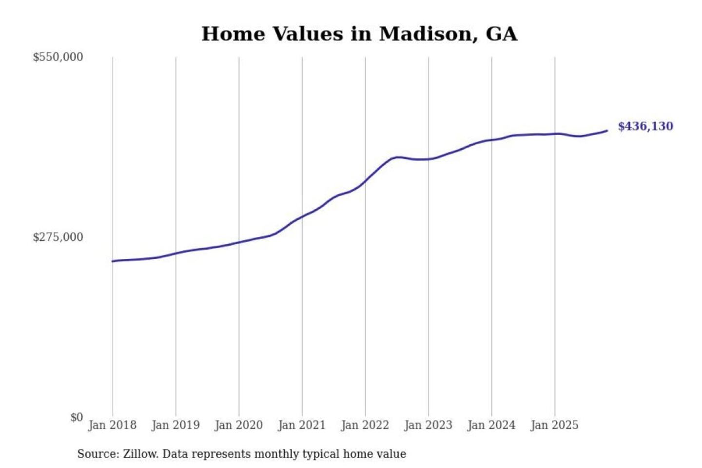 Stacker compiled a list of cities with the most expensive homes in the Atlanta-Sandy Springs-Alpharetta, GA metro area using data from Zillow. Charts show the monthly typical home value since January 2018.