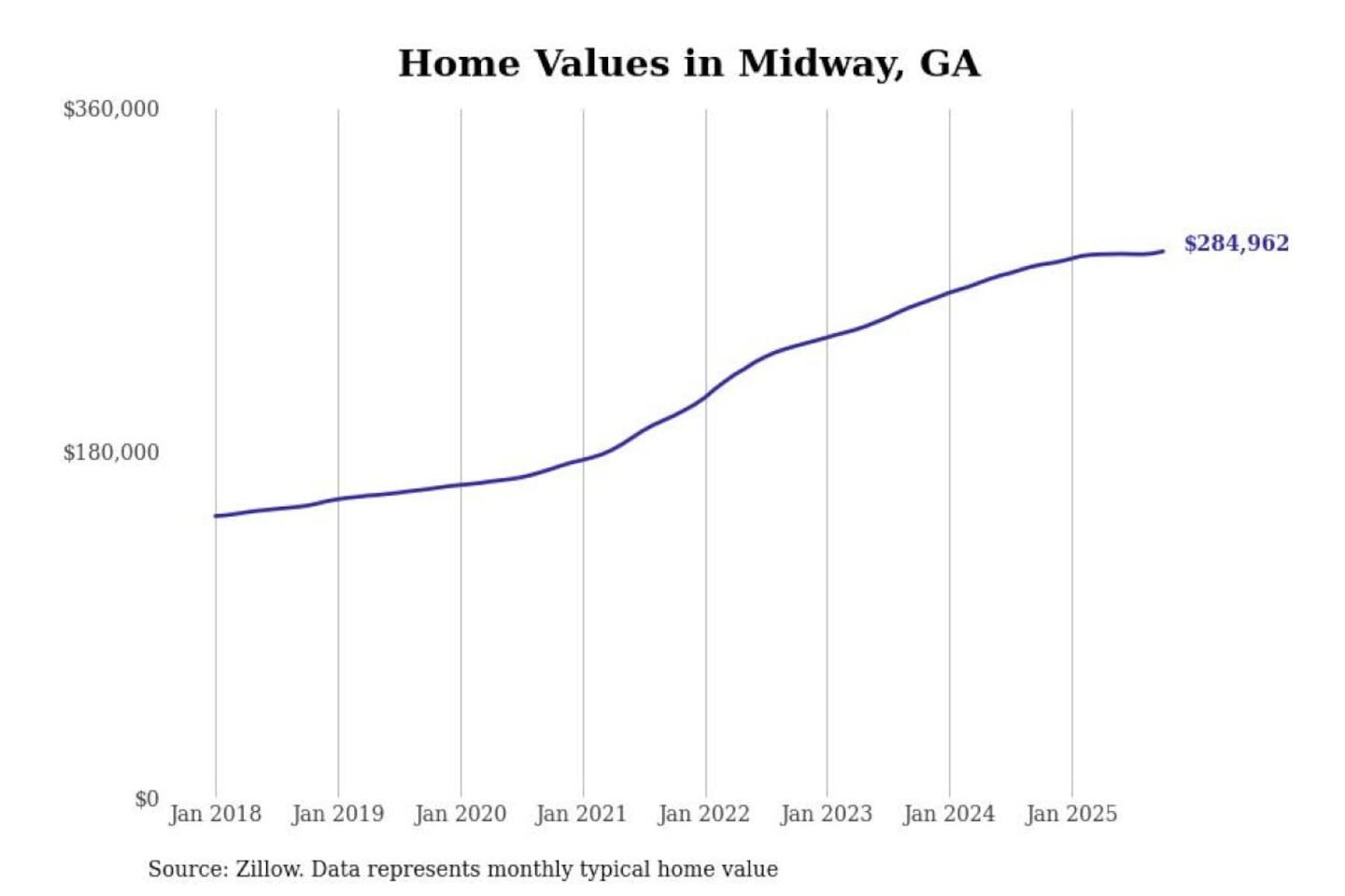 Stacker compiled a list of cities with the most expensive homes in the Hinesville, GA metro area using data from Zillow. Charts show the monthly typical home value since January 2018.