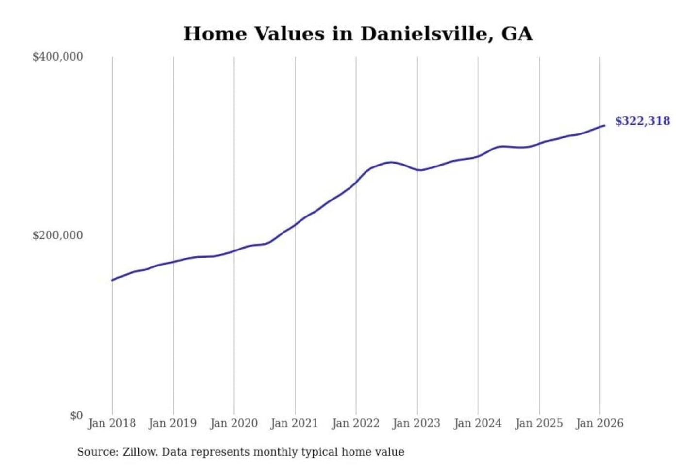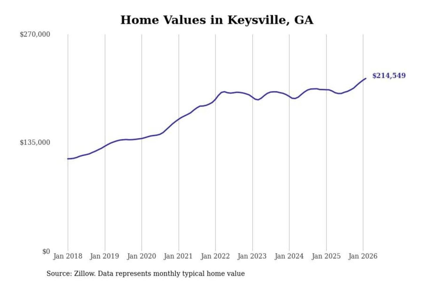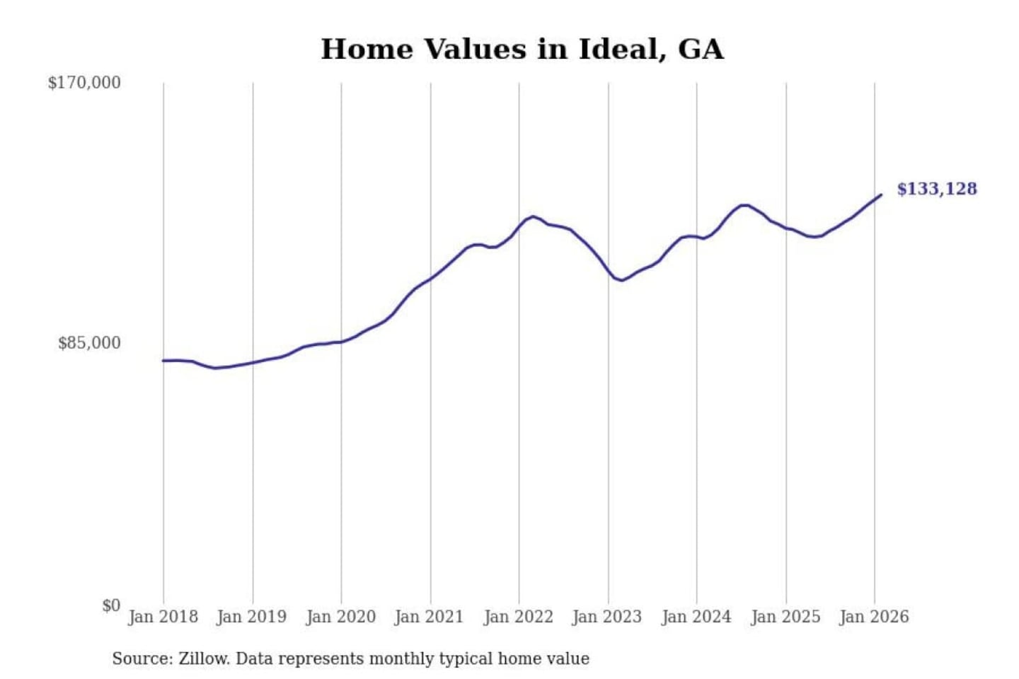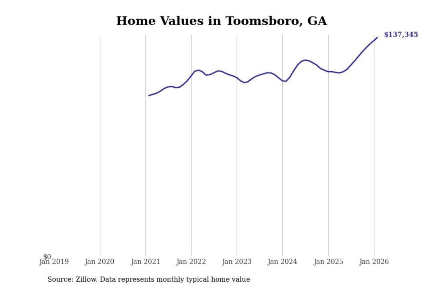 Stacker compiled a list of cities with the fastest-growing home prices in Georgia using data from Zillow. Cities are ranked by the dollar change in the Zillow Home Values Index for all homes from the 12 months ending February 2026. The charts in this story were created automatically using Matplotlib. Data was available for 50 cities and towns in Georgia.
