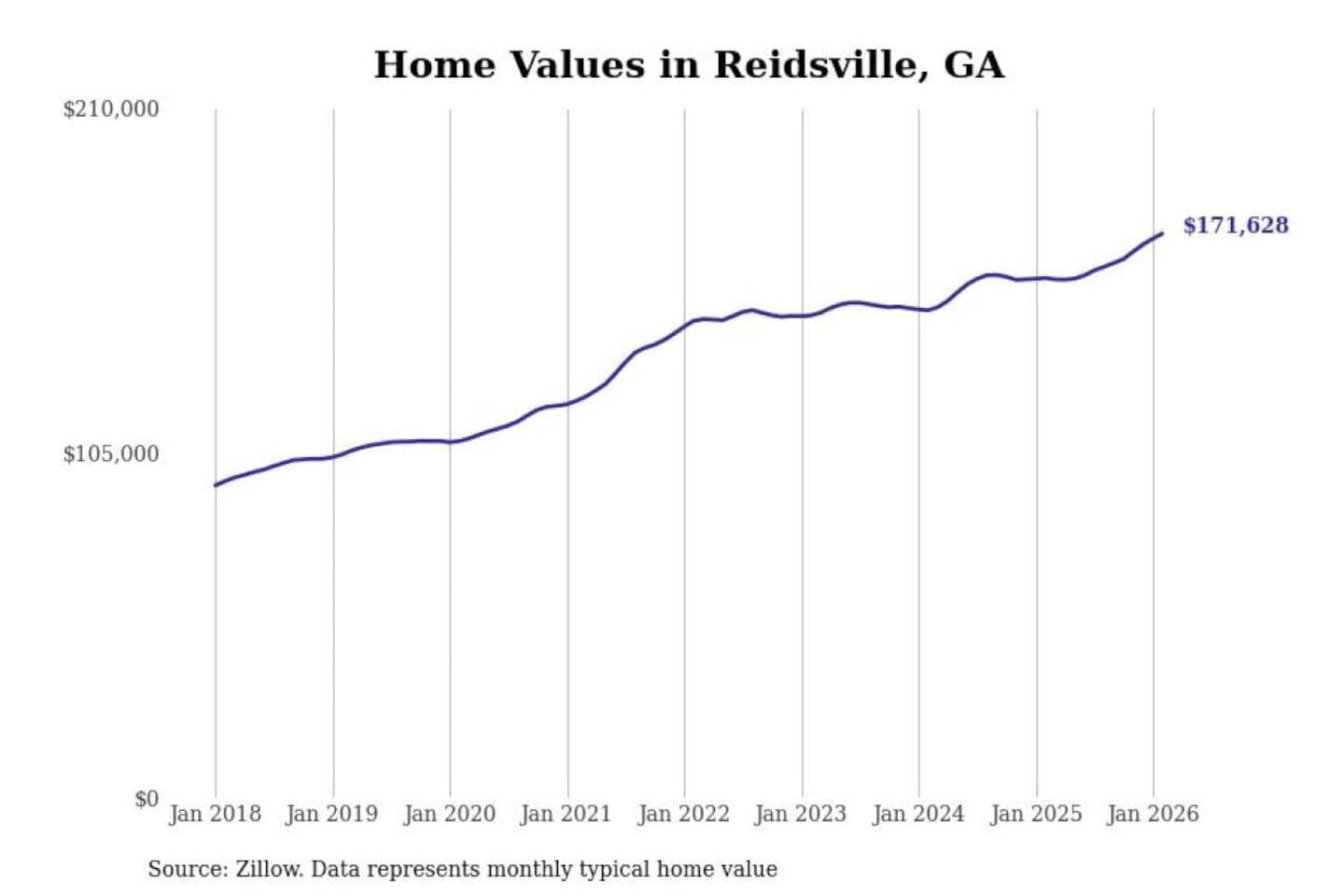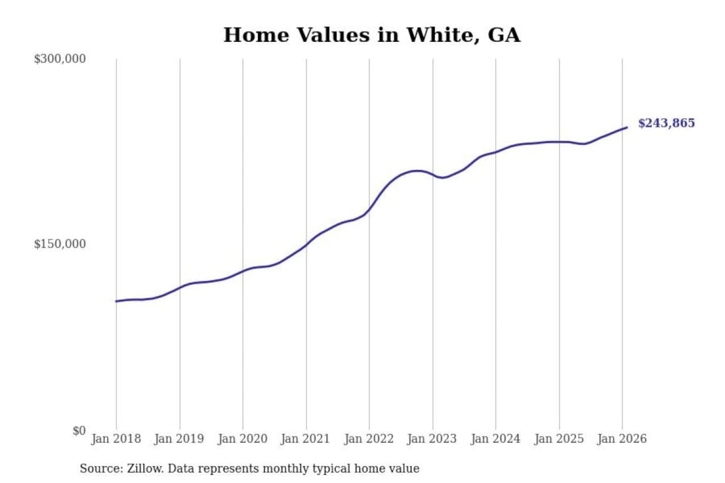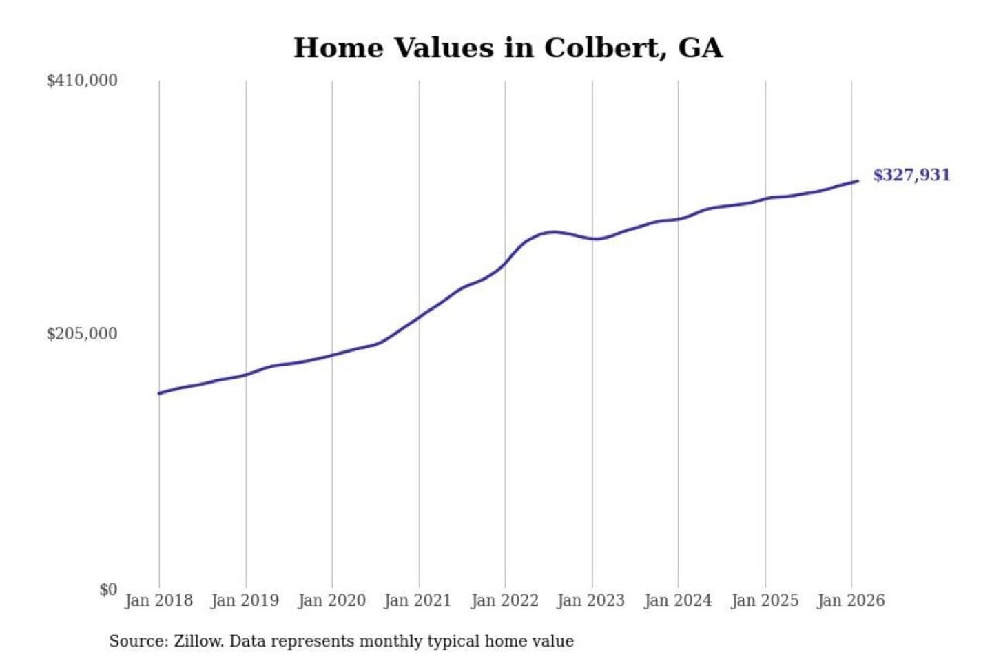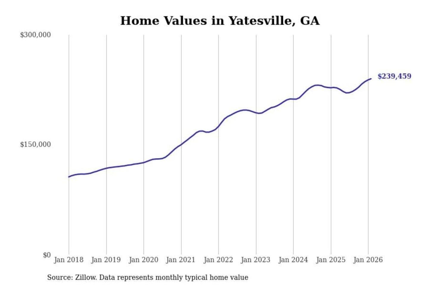 Stacker compiled a list of cities with the fastest-growing home prices in Georgia using data from Zillow. Cities are ranked by the dollar change in the Zillow Home Values Index for all homes from the 12 months ending February 2026. The charts in this story were created automatically using Matplotlib. Data was available for 50 cities and towns in Georgia.