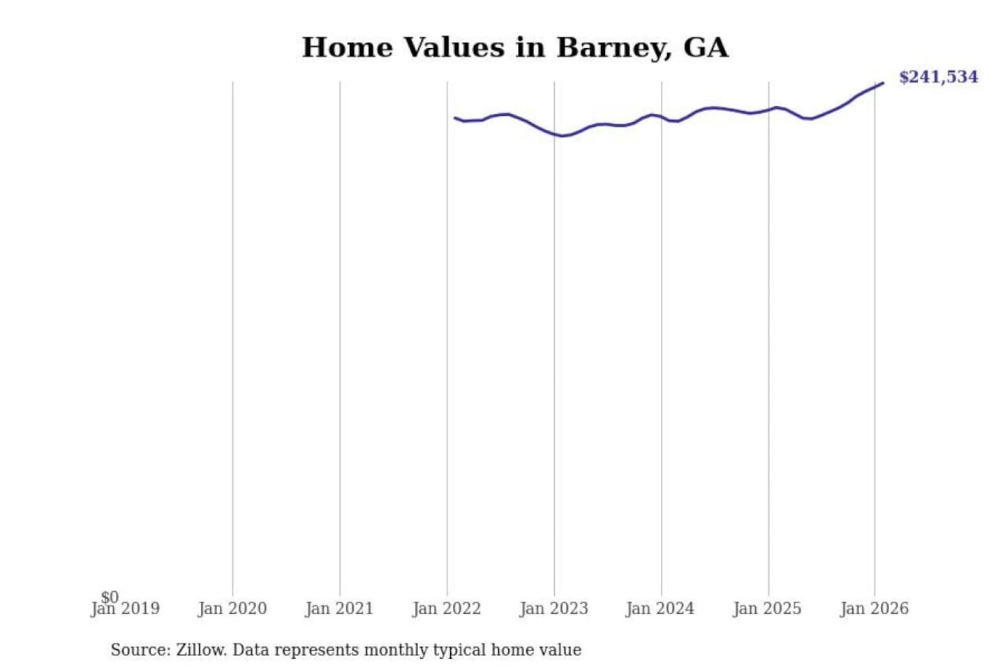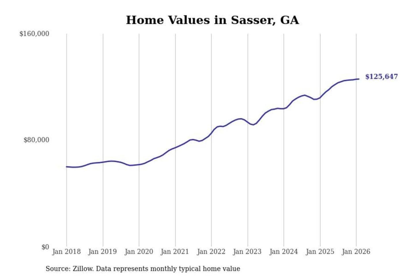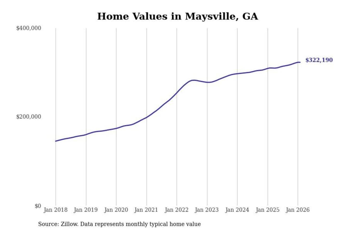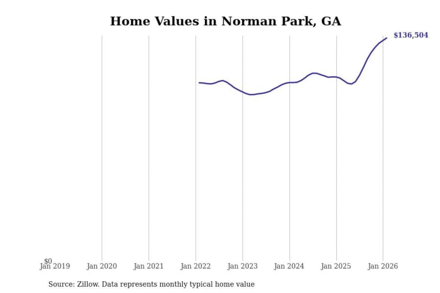 Stacker compiled a list of cities with the fastest-growing home prices in Georgia using data from Zillow. Cities are ranked by the dollar change in the Zillow Home Values Index for all homes from the 12 months ending February 2026. The charts in this story were created automatically using Matplotlib. Data was available for 50 cities and towns in Georgia.