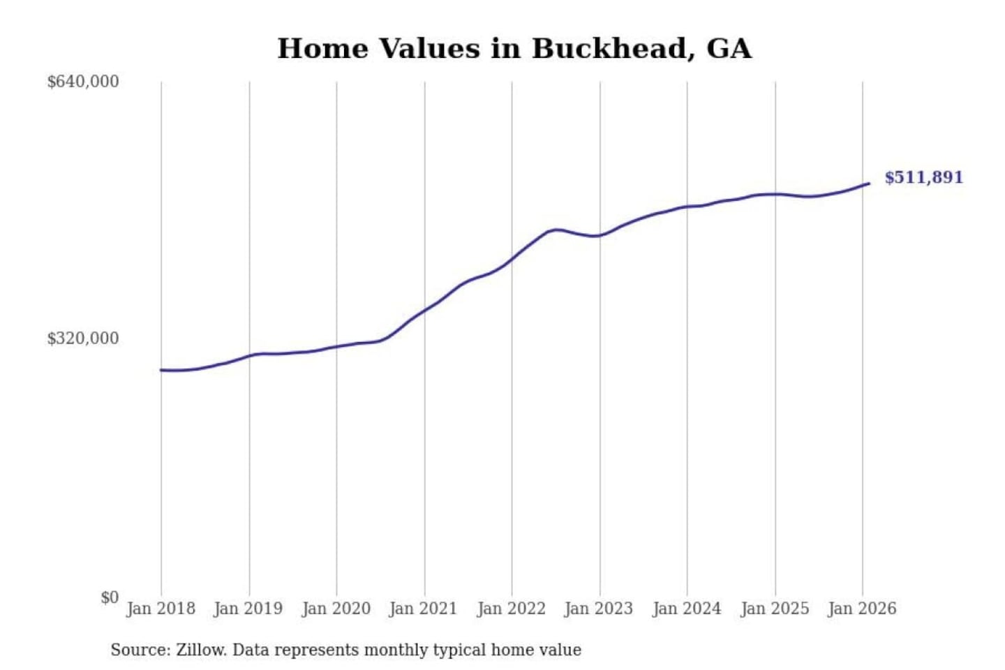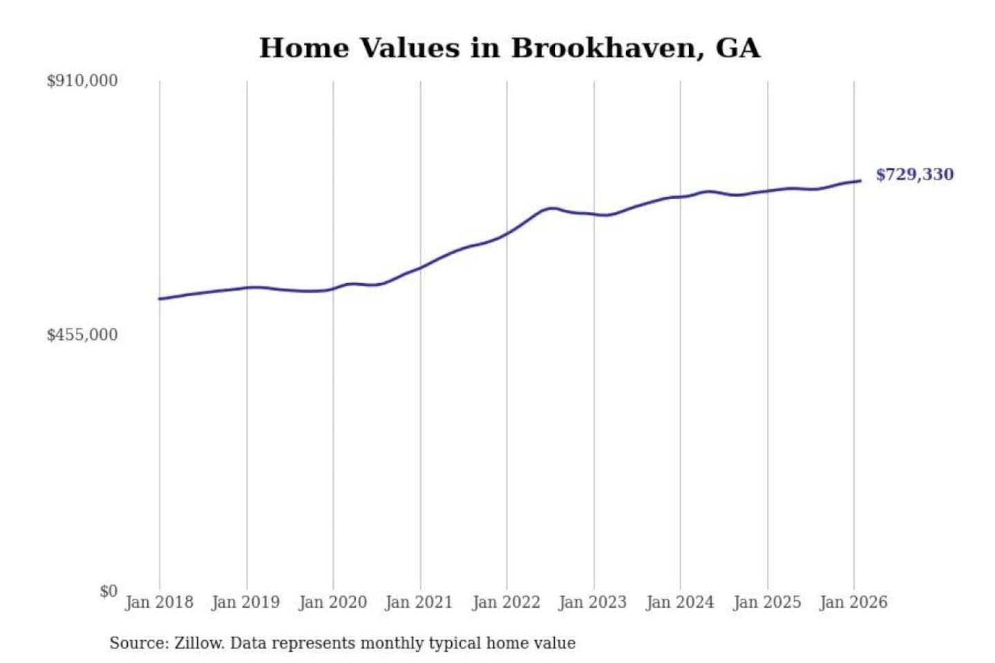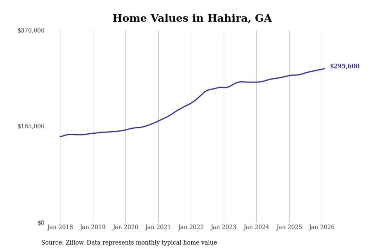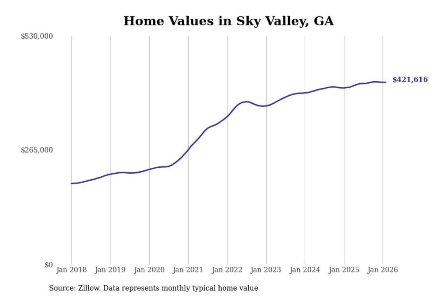 Stacker compiled a list of cities with the fastest-growing home prices in Georgia using data from Zillow. Cities are ranked by the dollar change in the Zillow Home Values Index for all homes from the 12 months ending February 2026. The charts in this story were created automatically using Matplotlib. Data was available for 50 cities and towns in Georgia.