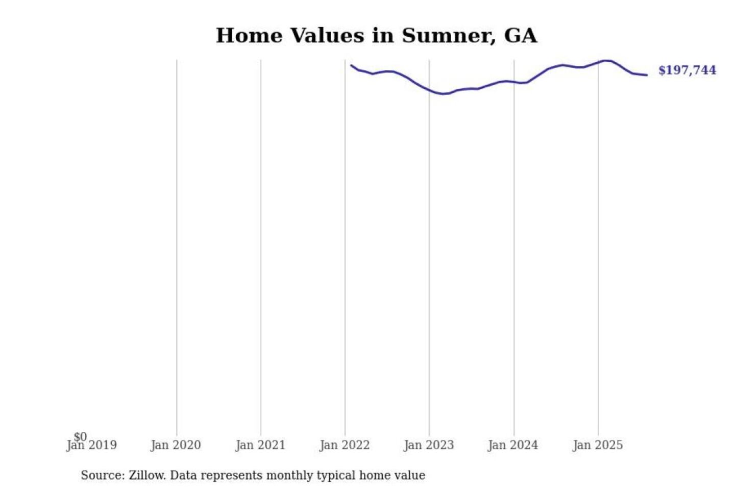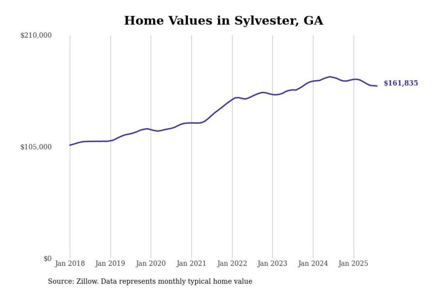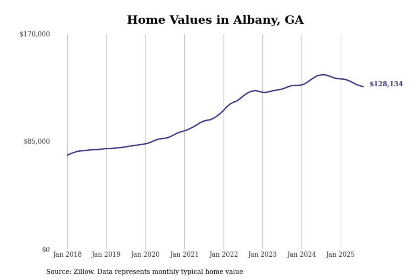 Stacker compiled a list of cities with the most expensive homes in the Albany, Georgia metro area using data from Zillow. Charts show the monthly typical home value since January 2018. All 13 cities and towns with data available were included in the list.