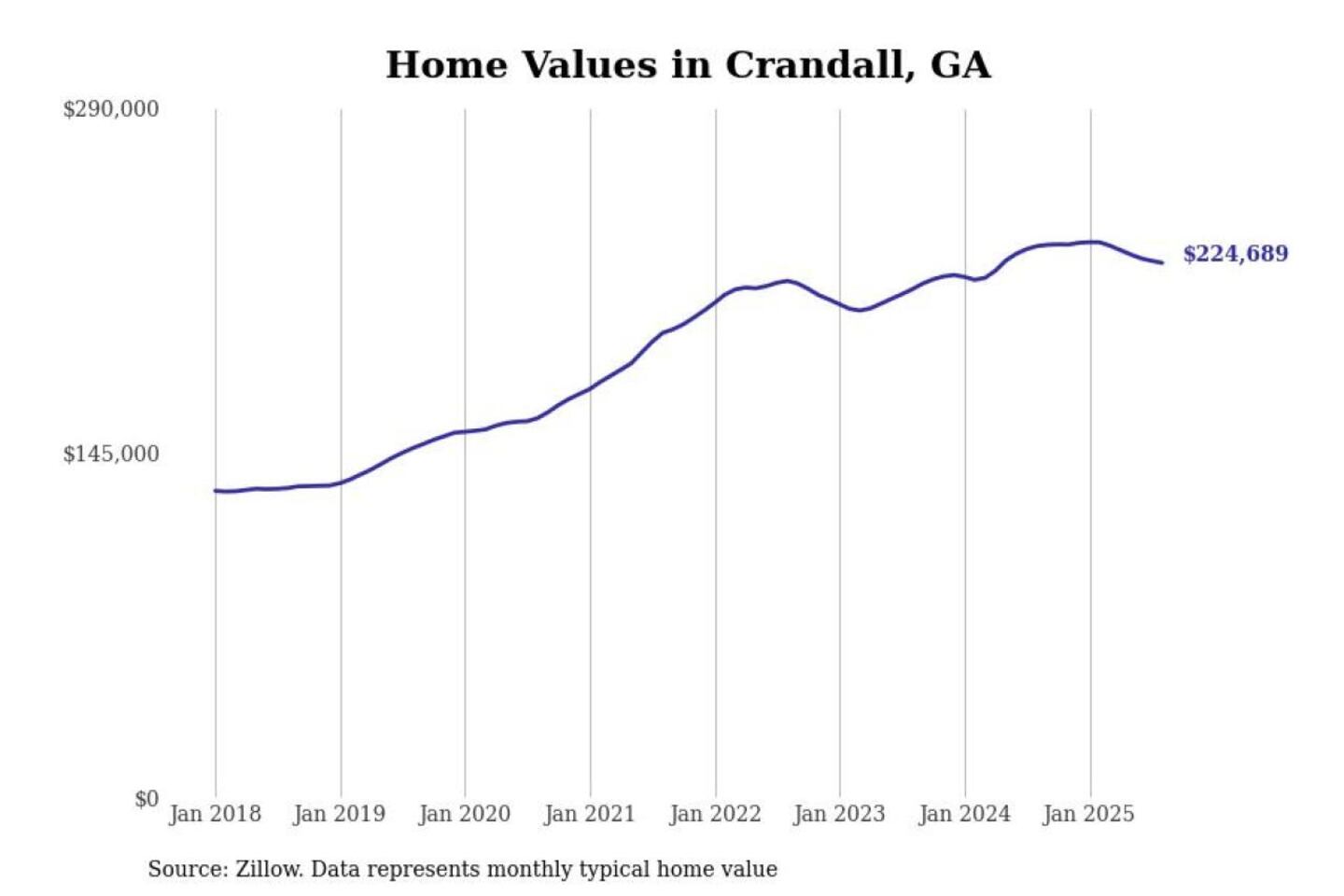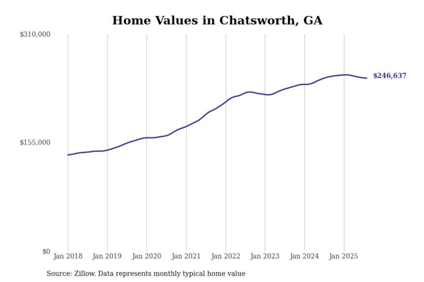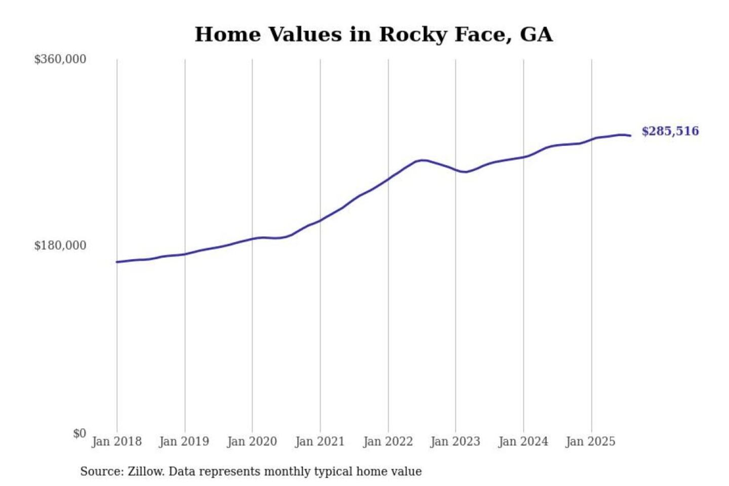 Stacker compiled a list of cities with the most expensive homes in the Dalton metro area using data from Zillow. Charts show the monthly typical home value since January 2018. All 8 cities and towns with data available were included in the list.