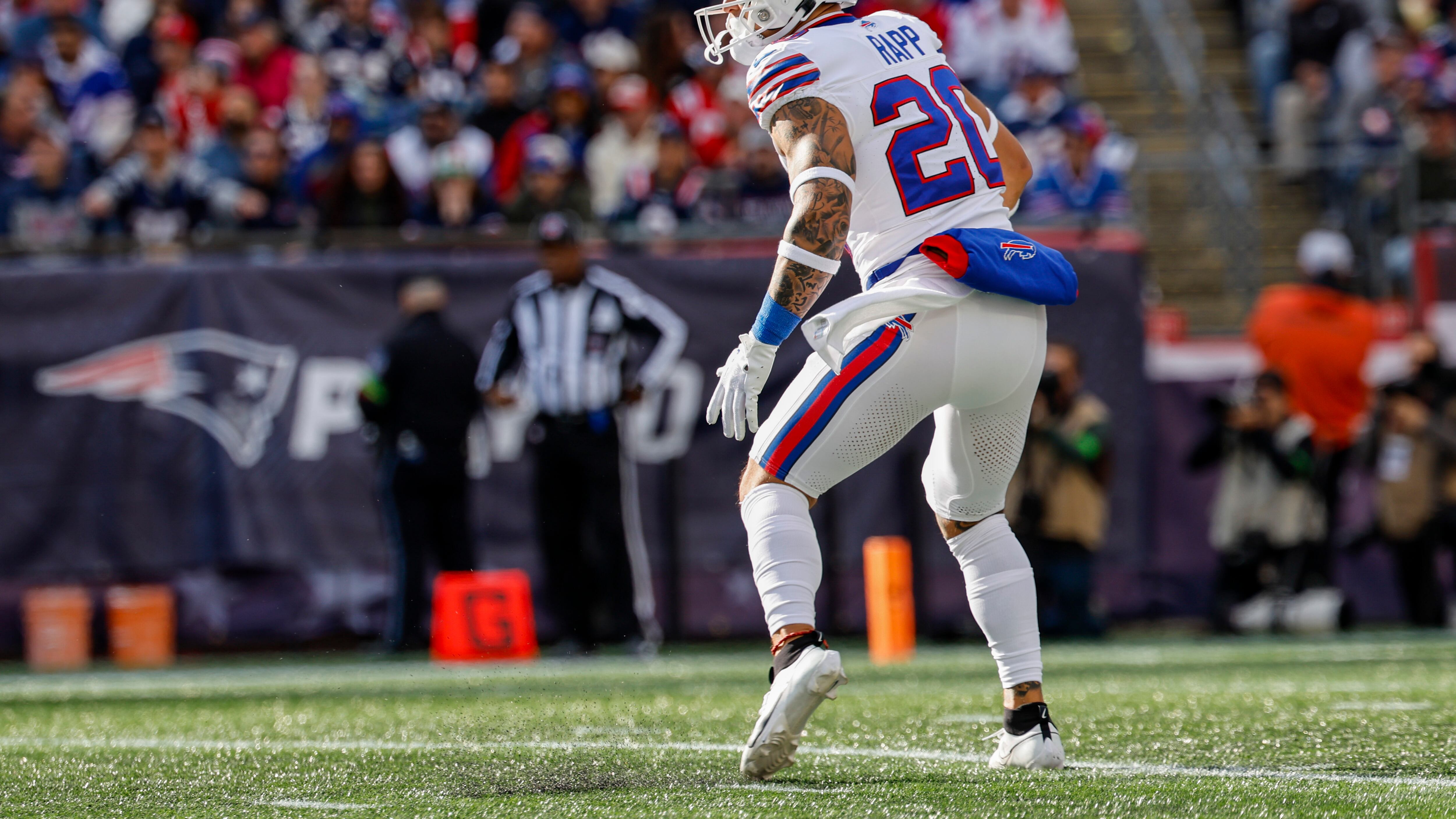 Buffalo Bills safety Taylor Rapp (20) drops into coverage during the second half of an NFL football game against the New England Patriots on Sunday, Oct. 22, 2023, in Foxborough, Mass. (AP Photo/Greg M. Cooper) (Greg M. Cooper/AP)