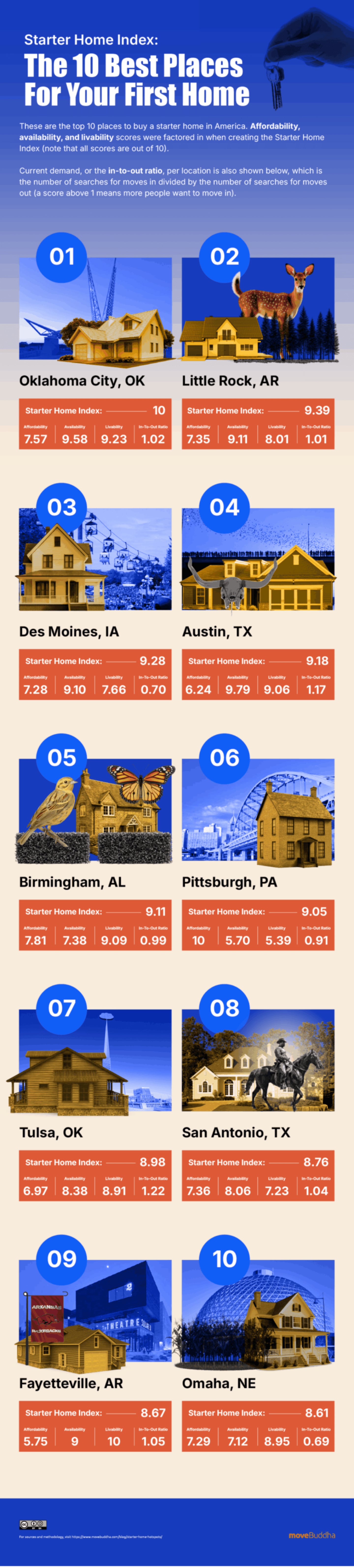 - #1 Oklahoma City is the top city for starter home buyers in the U.S., with high scores across the three core categories: affordability, availability, and livability. #2 Little Rock, #3 Des Moines, #4 Austin, and #5 Birmingham round out the top five.