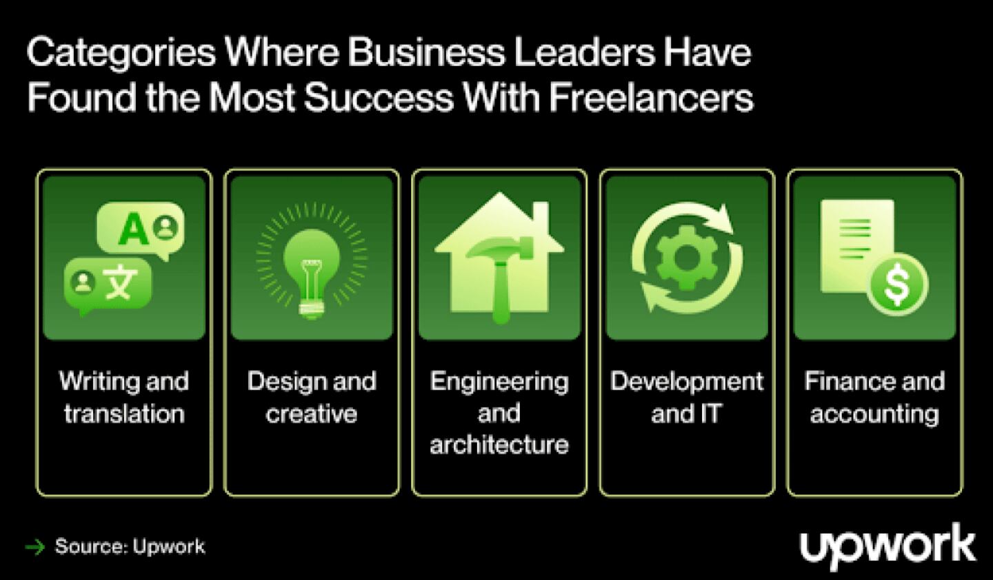 Finance and accounting work, such as bookkeeping, reporting, and forecasting, were also on the list of top categories where leaders are already successfully working with freelancers.