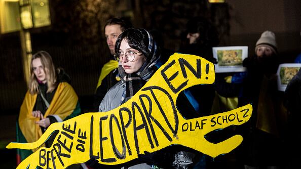 Ukrainians Protest For Delivery Of Leopard Tanks BERLIN, GERMANY - JANUARY 20: A protester holds a sign that reads "Free the leopards Olaf Scholz" as demonstrators, many of them expatriate Ukrainians living in Berlin, protest under the motto: "Free the Leopards" outside the Chancellery to demand that Germany send Ukraine Leopard battle tanks on January 20, 2023 in Berlin, Germany. German Chancellor Olaf Scholz, facing increasing pressure from Germany's allies, has indicated he is willing to allow the delivery of the German-made tanks to Ukraine under certain conditions. (Photo by Maja Hitij/Getty Images/Getty Images)
