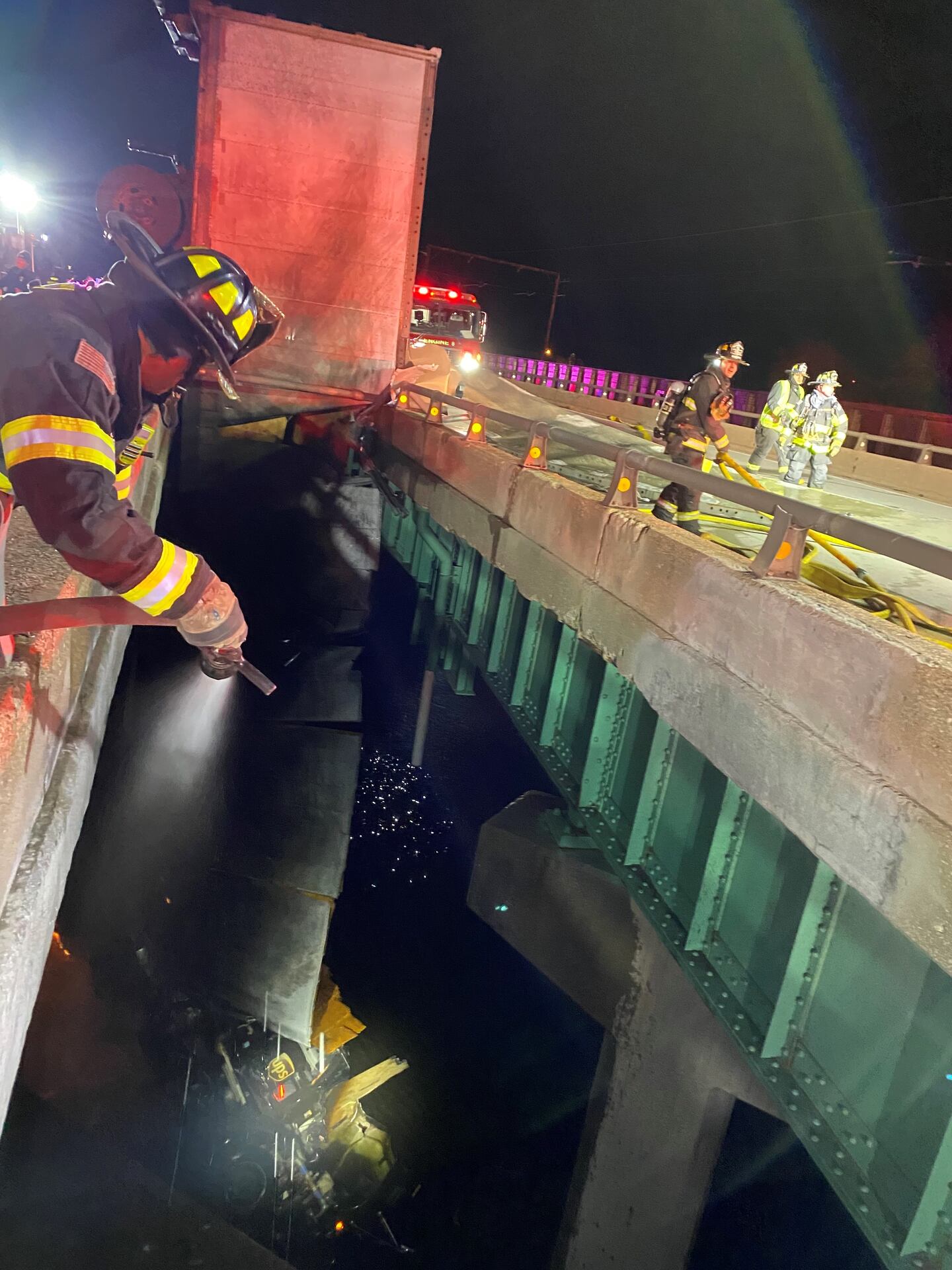 State police described the truck as remaining “perpendicular, hanging off the bridge in between the east and westbound lanes.” The crash also caused the truck to burst into flames.