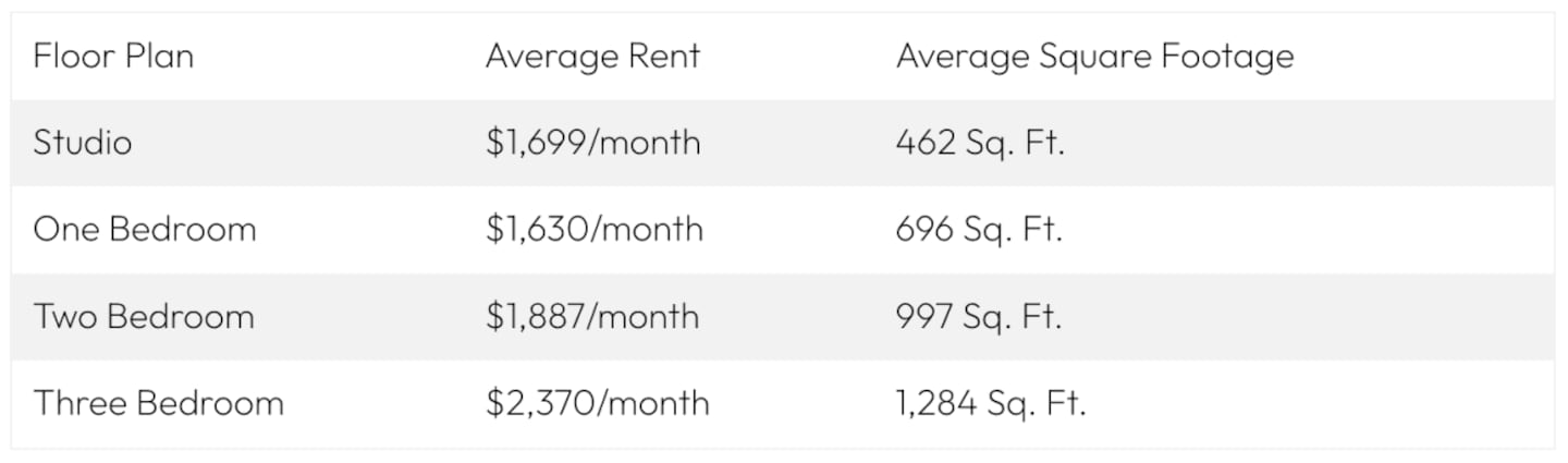 • Average One-Bedroom Size: 696 sq. ft.